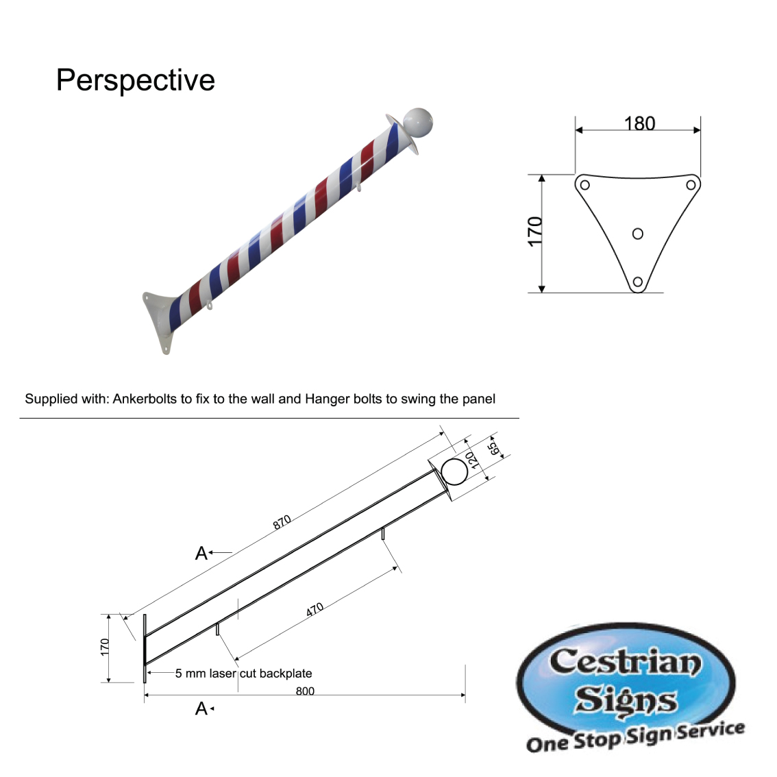 This pole is a sign in itself, but you can personalise it with a shaped panel, 60cm wide x 33-60cm high.