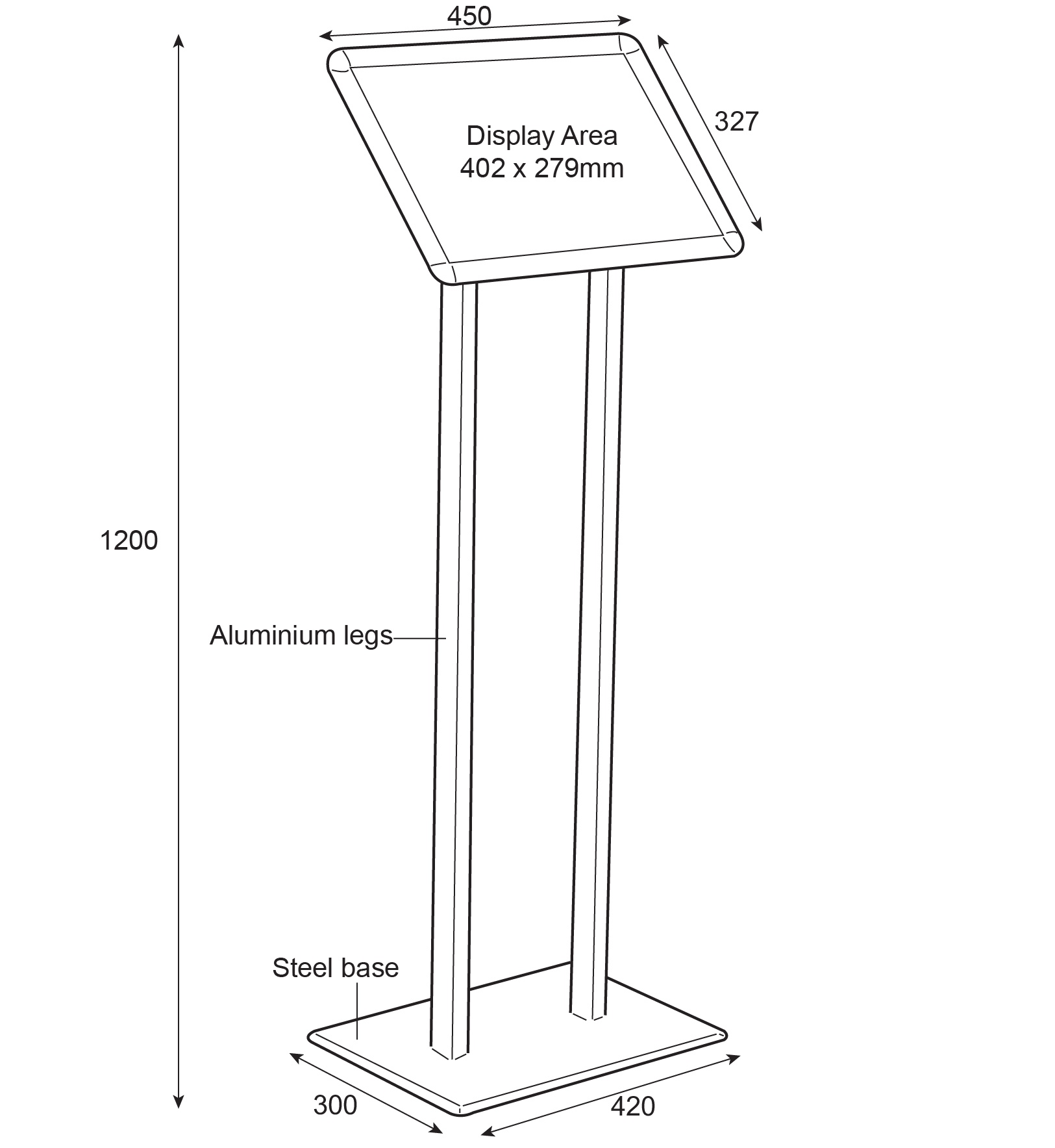 Dimensions: Base 420 x 300 mm, Height 1200mm, Frame 327 x 450mm. Weight 7kg.