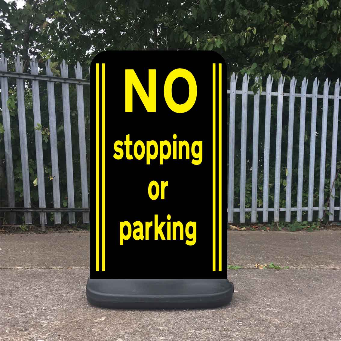 Water filled base pavement sign with 3 mm thick black HPL board anf floresant lettering..