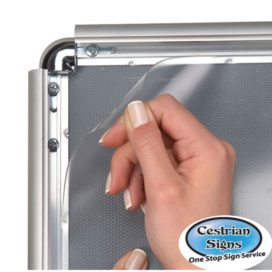 This double sided poster A-frame has easy snapframe openings to insert posters, and comes with clear plastic poster covers to protect against the elements.